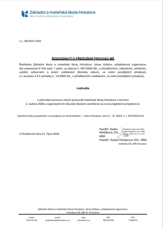 Holubická škola v současnosti zažívá velký boom. Základní školu navštěvuje 106 žáků a mateřskou školu 96 dětí. V mateřské škole pracuje devět pedagogů a školní asistentka. Nově je v provozu od začátku školního roku 2023/2024 samostatná pobočka matřské školy – lesní školka Holubinky umístěná v areálu Rakovec. V základní škole pracuje osm pedagogů a tři asistentky. Ve školní družině se dětem věnuje pět vychovatelek v ranním a odpoledním provozu.